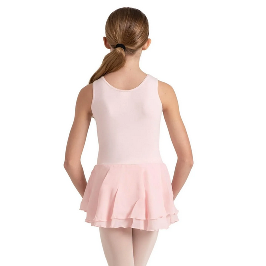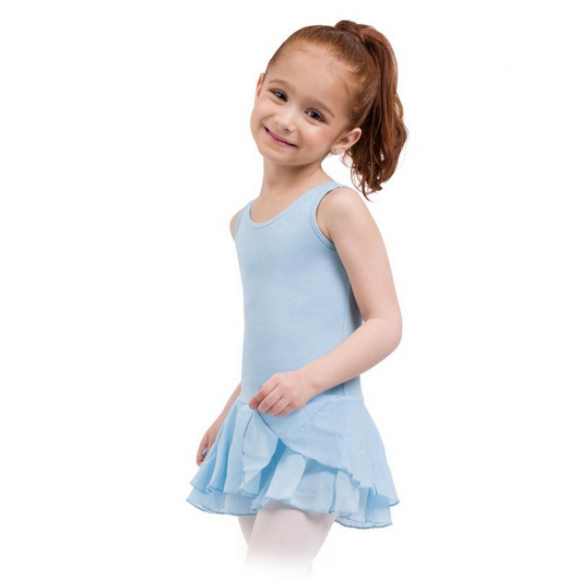 Lasten leveä olkaiminen tanssipuku, jossa kaksikerroksinen sifonkihame kiinnitettynä.